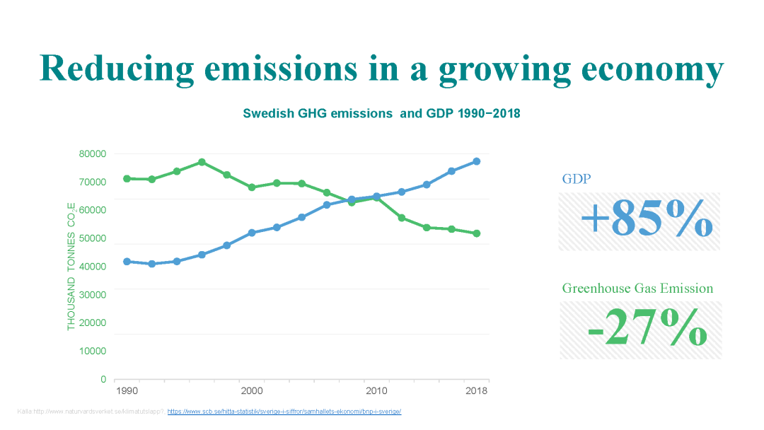 瑞典是提出來(lái)在2045年達(dá)到碳中和,中國(guó)是2060年,在這方面我們也是接下來(lái)一個(gè)很重要的工作重點(diǎn),我們目前也在跟瑞典駐華大使館做很多的交流,接下來(lái)可能會(huì)有很多這方面的戰(zhàn)略性的合作。這個(gè)圖片是想跟大家聊一下碳達(dá)峰、碳中和和經(jīng)濟(jì)的關(guān)系,有很多國(guó)家在比較靠前的時(shí)間就實(shí)現(xiàn)了碳達(dá)峰,有兩種原因。一種原因就是因?yàn)榻?jīng)濟(jì)沒(méi)有很好的發(fā)展,整體排放量不會(huì)增加。另一種經(jīng)濟(jì)還是快速發(fā)展,但是它的碳排放已經(jīng)脫鉤了,是一個(gè)下降的趨勢(shì),瑞典就是這種的一個(gè)代表。比如我們可以看到,它在九幾年的時(shí)候,綠線已經(jīng)達(dá)到了碳達(dá)峰,后續(xù)一直在降低。到2045年會(huì)達(dá)到中和,會(huì)到0左右。但是它的GDP一直是快速的增加,這個(gè)對(duì)碳中和是更加有意義的一種方向。