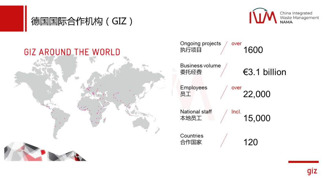 首先介紹一下德國國際合作機(jī)構(gòu),它其實(shí)算是德國的國企,唯一的股東是德國的經(jīng)合部,但是它是一個非盈利的企業(yè),我們所有的經(jīng)費(fèi)都來自于德國的政府以及歐洲的政府基金會。我們在全球有120多個辦事處,有兩萬多個員工,1980年進(jìn)入中國,目前有40多年的時間了。在中國有160個人,有100多位是中國同事,有60位是外國同事。