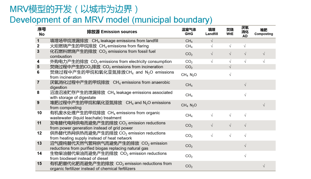 通過綜合的識別,我們對整個在城市范圍內(nèi)的垃圾管理有哪些是可能的和碳排放相關(guān)的排放源,我們識別出15個核心的排放源。溫室氣體的排放種類不僅有二氧化碳,也關(guān)注了甲烷和氧化亞氮,我們是非常創(chuàng)新和領(lǐng)先,針對焚燒廠可能會有一些氧化亞氮的排放,雖然排放量可能非常小,但是它的溫室氣體排放的潛力比二氧化碳,它的倍數(shù)是很高的,所以我們覺得應(yīng)該想要對它做一個監(jiān)測。