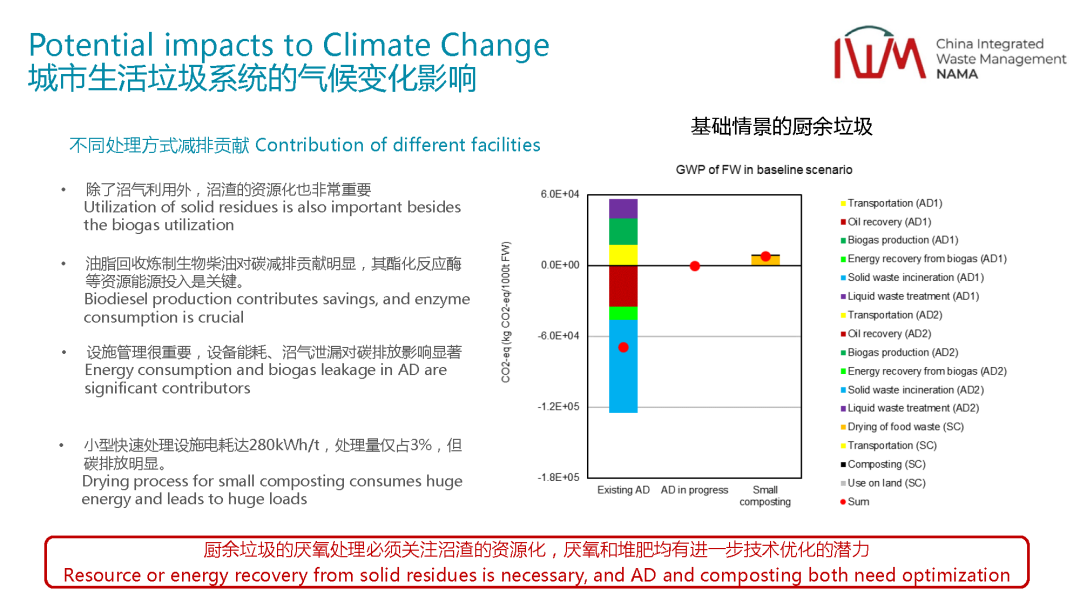 除了這個之外,我們也對不同的技術(shù)它的排放強(qiáng)度做了一個分析。比如剛剛說了,未來垃圾分類要開始了,有些垃圾都要被分出來了,都要處理,不同的處理技術(shù)它的減排貢獻(xiàn)是什么樣的,不同的技術(shù)處理有不同的技術(shù)路線,我們會分析堆肥,厭氧技術(shù),我們可以看到這個就是用了經(jīng)典的全生命周期的分析方法,我們委托丹麥科技大學(xué),是丹麥科技大學(xué)他們自行研發(fā)的一個分析工具,這個在垃圾領(lǐng)域是非常有名的,也得到了全球的認(rèn)可。在這個里面我們會去分析它不同的處理環(huán)節(jié)對減排的貢獻(xiàn),可以看到有機(jī)垃圾絕對是非常減排的,但是減排的前提是在于我除了要把沼氣用好之外,沼渣的資源化也非常重要。如果我的有機(jī)垃圾處理完了之后,沼渣要么實(shí)現(xiàn)土地利用,替代一部分的有機(jī)肥,或者回到土地去做碳匯,哪怕從純減排的角度,重新回到焚燒廠焚燒,實(shí)現(xiàn)資源的回收,這兩部分都可以貢獻(xiàn)比較明顯的減排量。但是沼渣處理之后回到填埋場,從整個流程來講,減排的效益沒有那么明顯,可能會導(dǎo)致一部分負(fù)面的影響。同時油脂的回收,去做生物柴油,這個對減排的貢獻(xiàn)是非常明顯的。