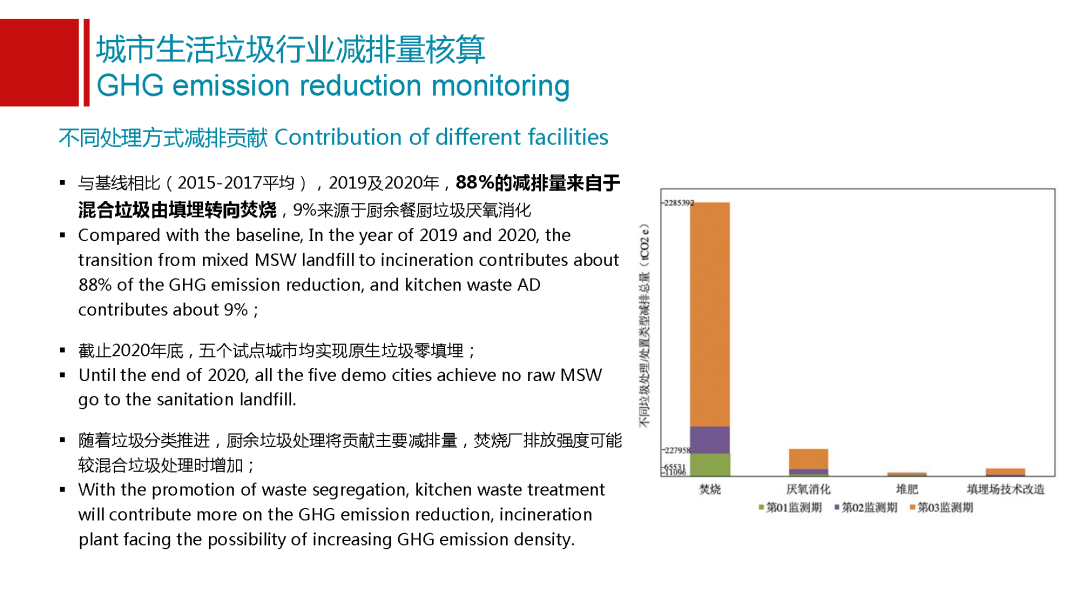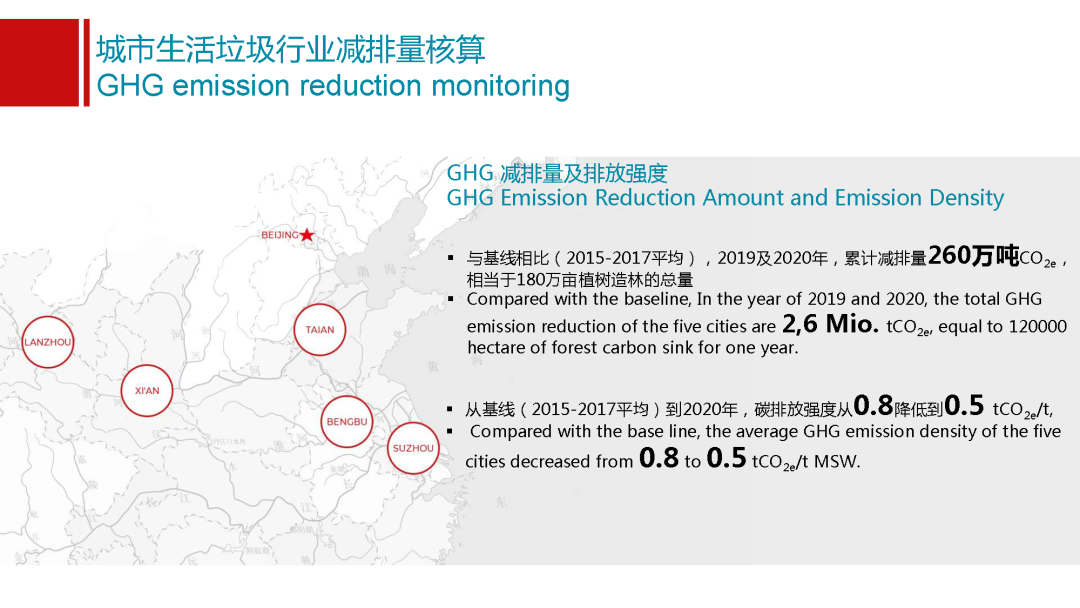 這里面也得到了試點(diǎn)城市特別主動的支持,在西安他們新建的焚燒廠配備了設(shè)備,這給我們國家的焚燒企業(yè)將來在這個行業(yè)里面他們的氧化亞氮的排放情況怎么樣,能夠提供第一手的數(shù)據(jù)。在這個基礎(chǔ)模型的處置上,我們有了幾個基線選擇,選擇了2015到17年三年的平均值,作為我們整個項目的基線。在這之后,2019年和2020年我們兩年分別去這五個城市做了監(jiān)測,可以看出有一些初步的結(jié)論。第一關(guān)于減排量和排放強(qiáng)度,這兩年從19年和20年,與基線相比,五個城市累計實(shí)現(xiàn)減排量260萬噸二氧化碳當(dāng)量,這個相當(dāng)于是180萬畝植樹造林,一年的碳匯地量,也是非??捎^的數(shù)據(jù)。除了排放總量,會有一個特別好的數(shù)值就是排放強(qiáng)度,垃圾管理行業(yè)排放強(qiáng)度是多少,從基線值到2020年,我們五個城市平均碳排放強(qiáng)度從0.8噸二氧化碳當(dāng)量每噸垃圾降到了0.5,能夠看出中國垃圾行業(yè)以五個試點(diǎn)城市為例,已經(jīng)實(shí)現(xiàn)向低碳化發(fā)展的轉(zhuǎn)型。碳排放強(qiáng)度的降低已經(jīng)達(dá)到了40%以上,能夠看到我們行業(yè)是在更清潔、更低碳,這個是一個特別有意義的數(shù)據(jù)。我們也分享給我們總部以及國際同事,他們非常認(rèn)可,能夠看到中國垃圾行業(yè)在向低碳方面轉(zhuǎn)型升級。