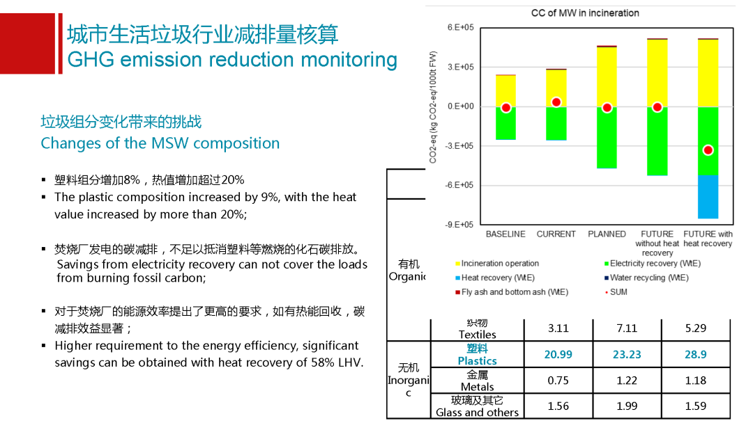 這是以蘇州為例,蘇州做的特別好,他們每年有定期大量的數(shù)據(jù)監(jiān)測,能夠證實(shí)我這個數(shù)據(jù)的科學(xué)性和可靠性??梢钥吹教K州從17年到19年它的塑料含量增加了8%,這個可能有比較多的原因。比如生活方式的改變,是不是用了更多的快遞,經(jīng)濟(jì)水平是不是更發(fā)達(dá)了,以及是不是有可能整個垃圾收運(yùn)管理體系以及環(huán)保要求更高,讓更多的品類進(jìn)入到我的垃圾體系里面來。但是我必須要看到整個垃圾處理,什么東西進(jìn)到焚燒廠,這個是有變化的。組分雖然增加了8%,但是對熱值貢獻(xiàn)是20%,如果焚燒廠不作出相應(yīng)的響應(yīng),不提高能效,之后產(chǎn)生的減排效益不足以抵消新增的塑料產(chǎn)生的排放,焚燒廠需要進(jìn)一步的優(yōu)化。對焚燒廠的能源效率提出更高的要求,我們初步核算一下,如果一個焚燒廠在目前我們的垃圾組分的情況下,我們現(xiàn)在五個城市的焚燒廠基本上都能夠?qū)崿F(xiàn)噸垃圾發(fā)電量400度左右,這個已經(jīng)很高了,他們的熱效率是在28%,還能夠維持比較好的狀態(tài)。但是如果我們將來熱值或者我的組分還會進(jìn)一步變化,因?yàn)槔诸愖龅脑絹碓胶?,肯定熱值會越來越高。我的焚燒廠的能效就要進(jìn)一步提高,否則可能會從一個有很好的減排效益的設(shè)施變化成碳排放強(qiáng)度可能是最高的,這個很重要。對焚燒廠來講,如果他能夠?qū)崿F(xiàn)熱能回收,就像我們上面那個圖,會給出一些建議。提高發(fā)電效率很重要,但是電和熱的回收能夠?qū)崿F(xiàn)更高的能效的利用,可能就會有更好的減排效益,這也是在焚燒企業(yè)將來去做發(fā)展戰(zhàn)略的時候需要重點(diǎn)考慮的一個問題。