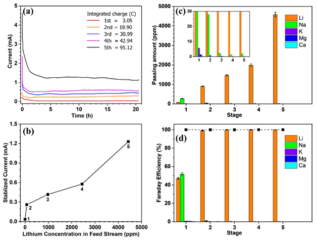 圖2.(a)提鋰過程中每一級的計時電流曲線,曲線與時間的積分即為該過程中遷移的總電荷量;(b)提鋰過程中穩(wěn)定電流與原料鋰濃度的關(guān)系;(c)提鋰過程中每一級的離子通過量;插圖顯示情節(jié)在低范圍內(nèi),以幫助查看干擾離子的結(jié)果:(d)提鋰過程中每一級中不同離子的遷移對電流的貢獻(xiàn)率。實(shí)心方塊表示總體效率(100%)。