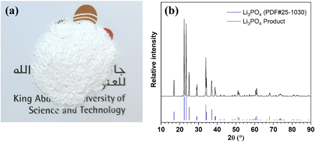 圖3.(a) 磷酸鋰產(chǎn)品;(b)磷酸鋰產(chǎn)品的XRD圖,附上標(biāo)準(zhǔn)圖譜作為對比。