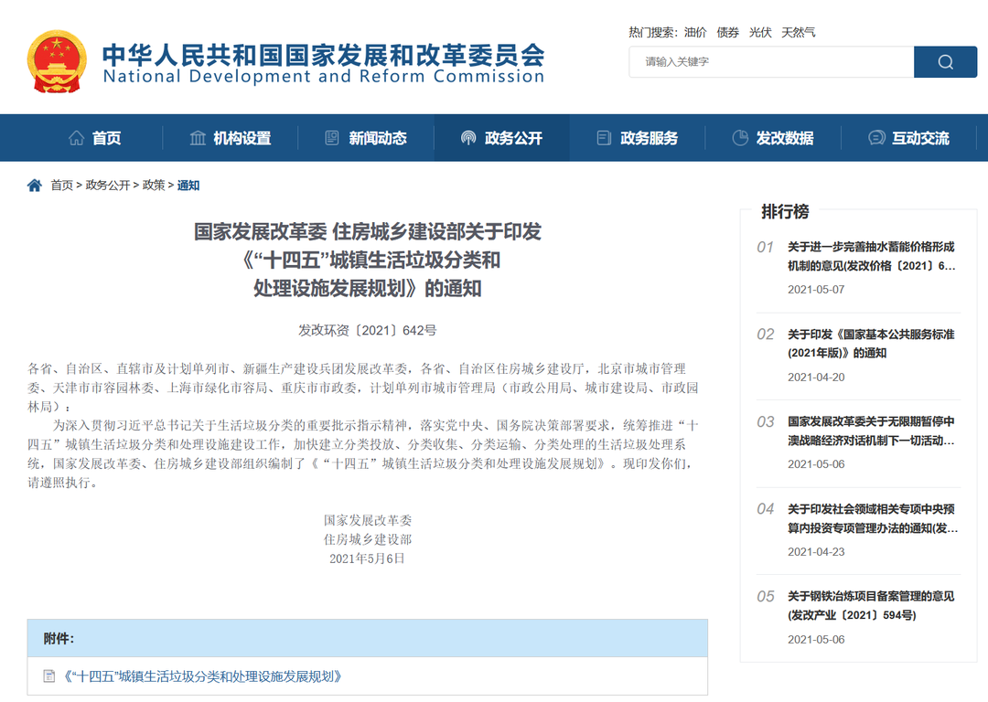 5月6日,國家發(fā)展改革委、住房城鄉(xiāng)建設(shè)部聯(lián)合下發(fā)關(guān)于印發(fā)《“十四五”城鎮(zhèn)生活垃圾分類和處理設(shè)施發(fā)展規(guī)劃》的通知(發(fā)改環(huán)資〔2021〕642號)。