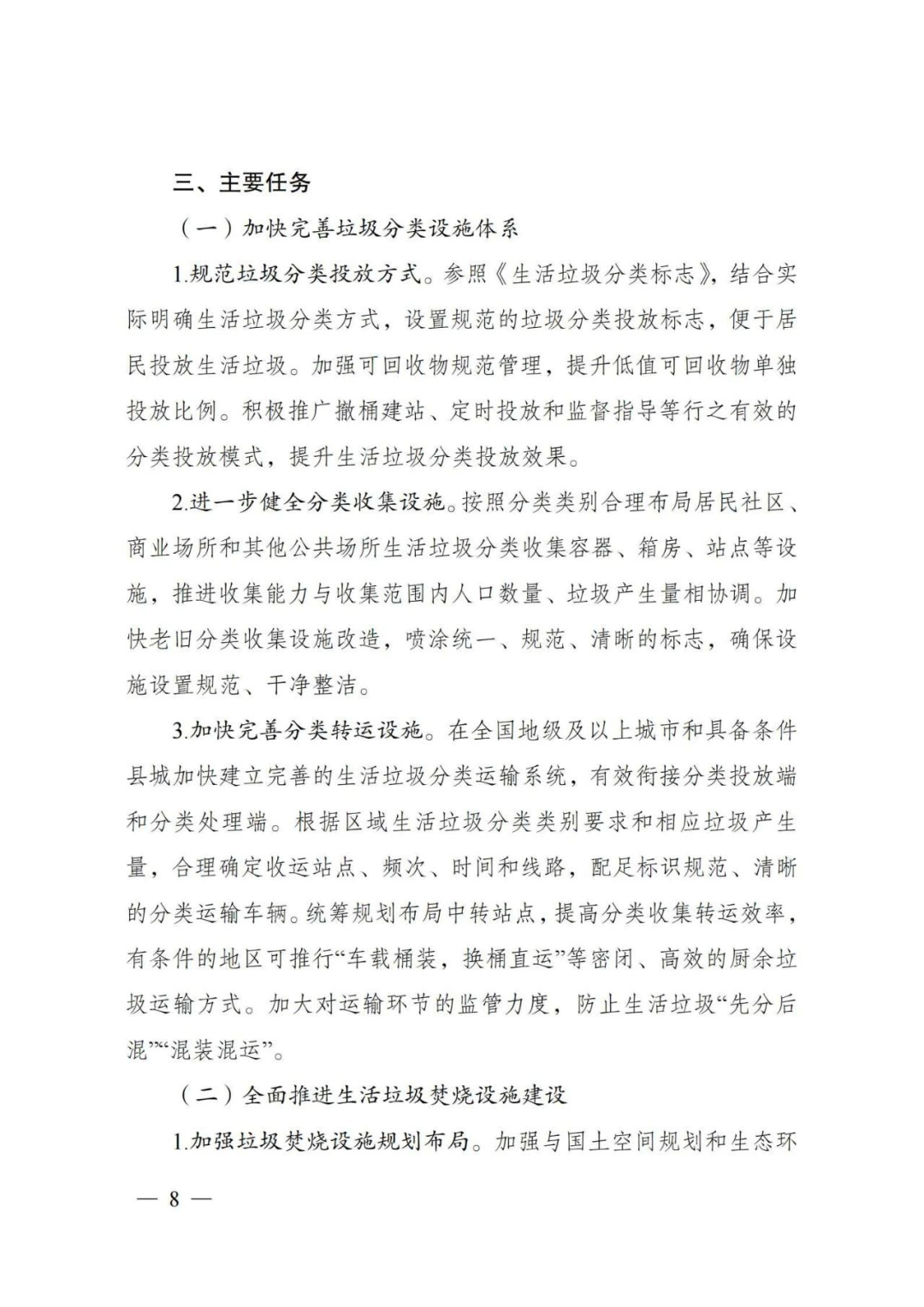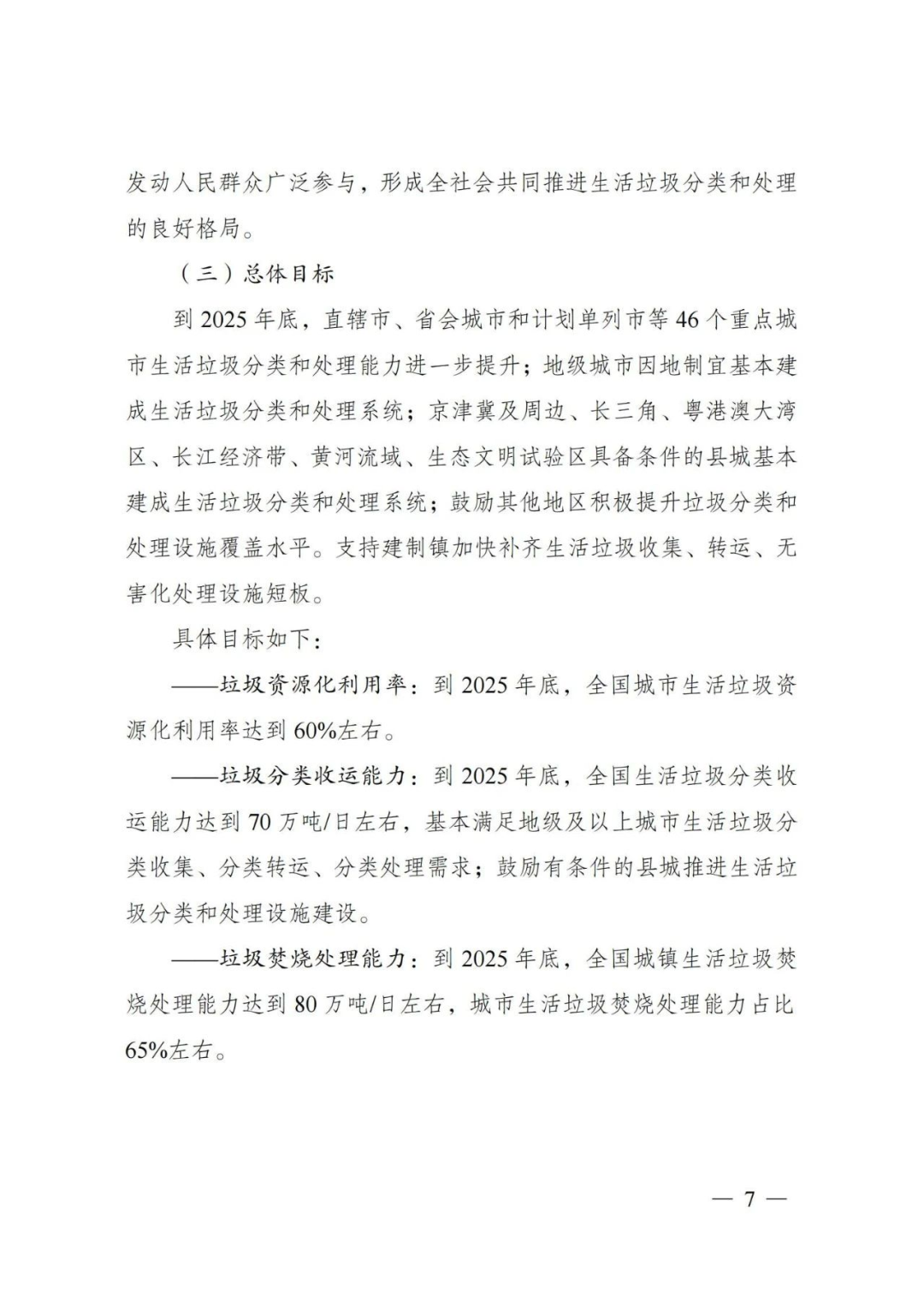 到2025年底,直轄市、省會城市和計劃單列市等46個重點城市生活垃圾分類和處理能力進一步提升;地級城市因地制宜基本建成生活垃圾分類和處理系統(tǒng);京津冀及周邊、長三角、粵港澳大灣區(qū)、長江經(jīng)濟帶、黃河流域、生態(tài)文明試驗區(qū)具備條件的縣城基本建成生活垃圾分類和處理系統(tǒng);鼓勵其他地區(qū)積極提升垃圾分類和處理設(shè)施覆蓋水平。支持建制鎮(zhèn)加快補齊生活垃圾收集、轉(zhuǎn)運、無害化處理設(shè)施短板。
