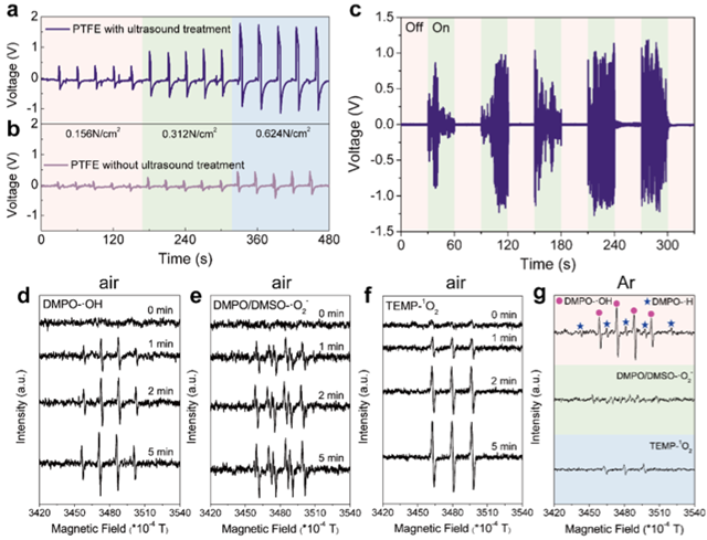 進一步,本研究通過施加外力并測量開路電壓來揭示 PTFE 駐極體的壓電特性(圖 3a、b)。 隨著外加壓力從 0.156 增加到 0.624 N/cm2,開路電壓從 0.5 V增加到 1.8 V。此外,活化的PTFE膜在超聲波的作用下能產生可重現的壓電電壓(圖 3c)。這揭示了惰性的PTFE超聲催化活性的基本過程及機制,包括1) PTFE在超聲壓力場下的駐極化活化,以及2) 高頻超聲壓力波持續(xù)刺激壓電PTFE駐極體產生迅速交變的內部電場,從而驅動電荷到PTFE/水界面并最終產生ROS (圖 3d, e, f)。