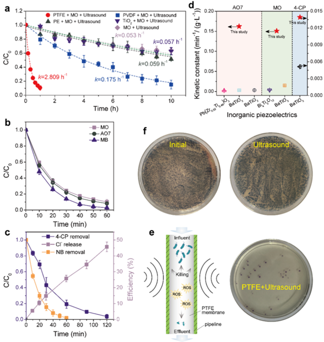 PTFE壓電催化產生ROS的潛在應用:ROS在環(huán)境、化學以及生物醫(yī)藥領域具有廣泛應用。例如,PTFE在超聲作用下能分解甲基橙、酸性橙7、亞甲基藍、四氯酚以及硝基苯等多種污染物。與傳統有機和無機壓電材料對比發(fā)現,PTFE分解甲基橙的準一級速率常數是經典的有機壓電材料PVDF的16倍以上,也遠高于目前文獻報道的無機壓電材料Pb(Zr0.52Ti0.48)O3,Bi4Ti3O12和BaTiO3。同時實驗結果表明,超聲輻射10 min,PTFE膜能顯著抑制細菌的生長,抑制率可達99.7%。以上結果表明,超聲活化的PTFE展現出了優(yōu)異的壓電催化性能,在環(huán)境污染治理中具有廣闊的應用前景。