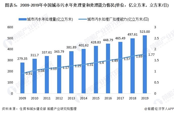除了供水外,污水處理也是目前水務(wù)行業(yè)重點關(guān)注的領(lǐng)域之一。從污水處理的供給來看,由于城鎮(zhèn)化和經(jīng)濟發(fā)展需求,中國城市近年來污水產(chǎn)生量和處理量呈上升趨勢。從城市污水處理情況來看,截至2019年底,全國城市污水處理廠處理能力1.77億立方米/日,累計處理污水量523億立方米。