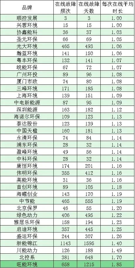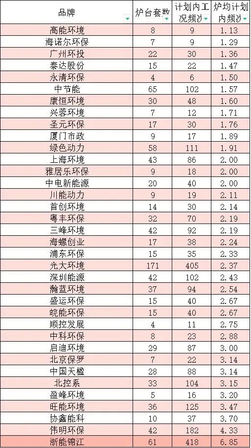 數(shù)據(jù)顯示,順控發(fā)展、粵豐環(huán)保、高能環(huán)境、興蓉環(huán)境、深能環(huán)保等五家品牌企業(yè),旗下每臺焚燒爐的非停頻次平均都小于1。