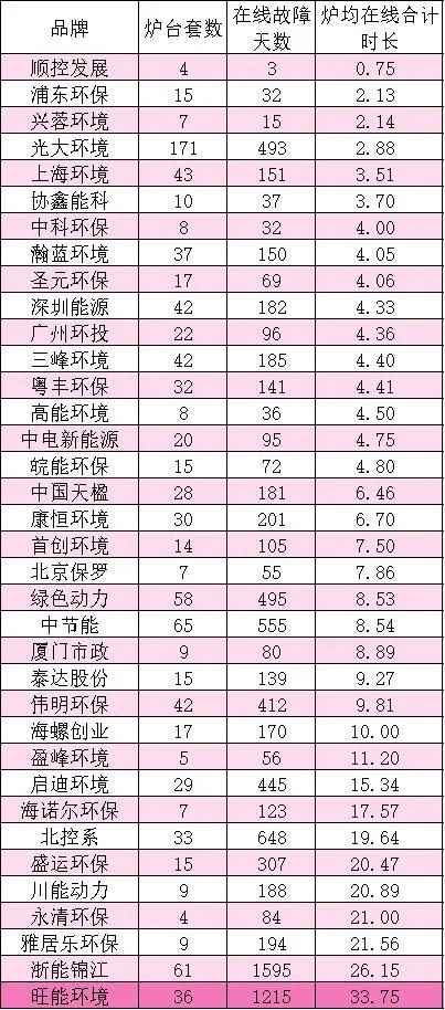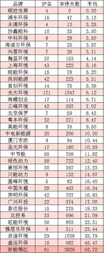此榜單主要是衡量不同品牌旗下焚燒爐,每次非計劃停爐的平均時長,主要是與衡量故障大小狀況有關(guān),如果導(dǎo)致非停的故障較大,就必然要延長檢修時間。