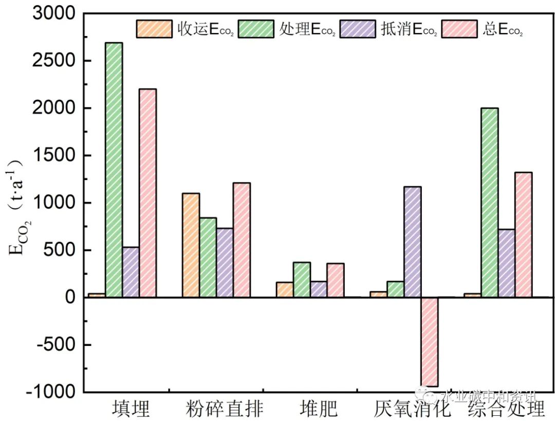 評(píng)估的LCA包括餐廚垃圾收集與運(yùn)輸、處理、產(chǎn)物各個(gè)處置環(huán)節(jié);LCA之碳排放涉及的溫室氣體包括CO2、N2O和CH4;N2O和CH4造成的溫室效應(yīng)分別乘以298、25折算為CO2當(dāng)量——ECO2。經(jīng)微生物分解代謝作用產(chǎn)生的CO2為生物成因(生源性),是有機(jī)物的自然歸宿,不列入碳排放計(jì)算;產(chǎn)生的CH4經(jīng)回收后用于發(fā)電或熱電聯(lián)產(chǎn)(CHP),這一途徑形成的碳排放不納入LCA碳排放匯總與計(jì)算。被回收的能源與資源可相應(yīng)地抵消碳排放量,主要包括由CH4用于發(fā)電或CHP后回收的電能或(和)熱能與可用作肥料的沼渣;產(chǎn)生的熱能除滿足自身升溫需求之外,未利用的剩余熱能不計(jì)入抵消ECO2項(xiàng)目?jī)?nèi)。每kW·h電能可抵消0.608 kg ECO2,每kg肥料(以N計(jì))可抵消4 kg ECO2。據(jù)此計(jì)算各餐廚垃圾處置方式對(duì)應(yīng)的年ECO2數(shù)據(jù)(圖3)。