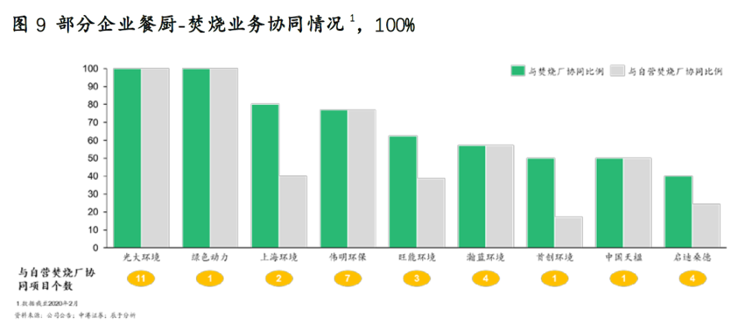 在垃圾分類全面推行的大背景下,這些大型固廢企業(yè)正利用協(xié)同優(yōu)勢(shì)降維打擊(見(jiàn)圖9)。一方面,垃圾焚燒主業(yè)帶給這些企業(yè)資金和政府資源雙重優(yōu)勢(shì);另一方面,協(xié)同處置帶來(lái)降本增效,可以幫助這些企業(yè)降低財(cái)務(wù)壓力:在收入端,協(xié)同優(yōu)勢(shì)在于餐廚沼渣余電上網(wǎng);而在成本端,除可節(jié)約土建、人工等成本外,干濕垃圾處置的發(fā)電設(shè)備、除臭系統(tǒng)、滲濾液處理系統(tǒng)、蒸汽供熱系統(tǒng)等也可共用,從而降低折舊攤銷成本。