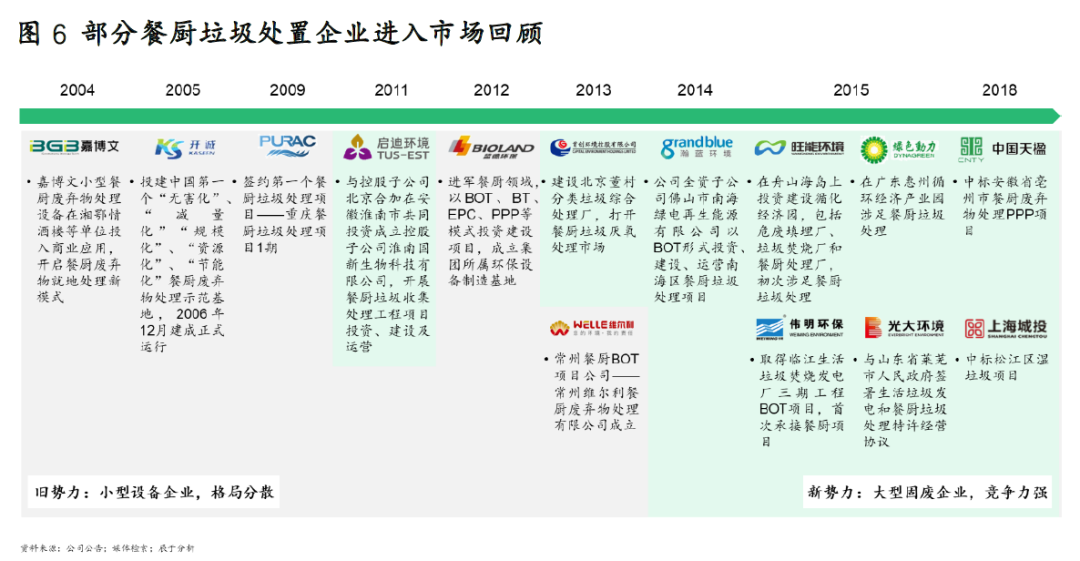 回顧我國(guó)餐廚垃圾處理行業(yè)的發(fā)展歷程,可以看到過(guò)去十幾年由于市場(chǎng)規(guī)模小、發(fā)展慢,并未引起足夠重視,主要是一些小型設(shè)備企業(yè)“小打小鬧”,市場(chǎng)比較分散,競(jìng)爭(zhēng)并不激烈。不過(guò)近幾年,隨著垃圾分類帶來(lái)的需求激增,包括光大環(huán)境、中國(guó)天楹、上海城投等大型固廢企業(yè)紛紛進(jìn)入,硝煙四起(見(jiàn)圖6)。