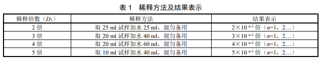 用量筒(6.6)取第 n−1 次初級稀釋的試料,按照表 1 的稀釋方法由小到大逐級按自然倍數(shù)進(jìn)行稀 釋,每稀釋 1 次,混勻后按目視比色方法(8.3)觀察,直到剛好與水(5)無法區(qū)別時停止稀釋,記錄稀釋倍數(shù) D1。