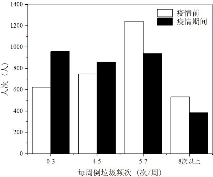 疫情導致社區(qū)垃圾分類基礎成分產生明顯變化,廢棄口罩大量增加,居民投放垃圾頻次顯著降低。疫情期間,人均廢棄口罩產生頻次約為3.7個/周,將近一半(48.2%)被調查者平均每周產生廢棄口罩數(shù)量在0~3個范圍;30.6%居民投放垃圾頻率降低,由疫情前5~7次向疫情期間低頻段轉變趨勢明顯,疫情越嚴重地區(qū)口罩產頻更高、投放垃圾頻率降低更多。針對垃圾組分變化,社區(qū)應貫徹落實垃圾分類,對涉疫垃圾分類分流收集處置,并靈活調整疫情期間垃圾清運計劃,總結居民行為規(guī)律,適時調減清運頻次降低成本。