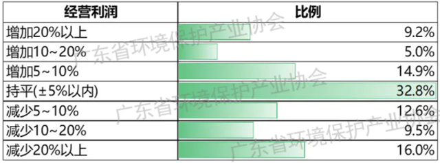 營(yíng)業(yè)利潤(rùn)方面,29.1%的環(huán)保企業(yè)實(shí)現(xiàn)利潤(rùn)同比增長(zhǎng),32.8%的企業(yè)利潤(rùn)與上年同期持平,38.1%的企業(yè)利潤(rùn)下降。