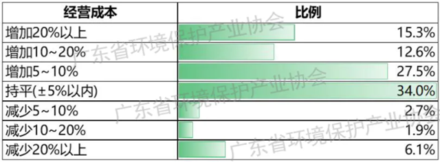 經(jīng)營(yíng)成本方面,環(huán)保企業(yè)經(jīng)營(yíng)成本普遍上升。調(diào)查企業(yè)中,55.3%的環(huán)保企業(yè)反饋成本同比上升,34.0%的環(huán)保企業(yè)基本持平,僅有10.7%的企業(yè)反饋成本下降。