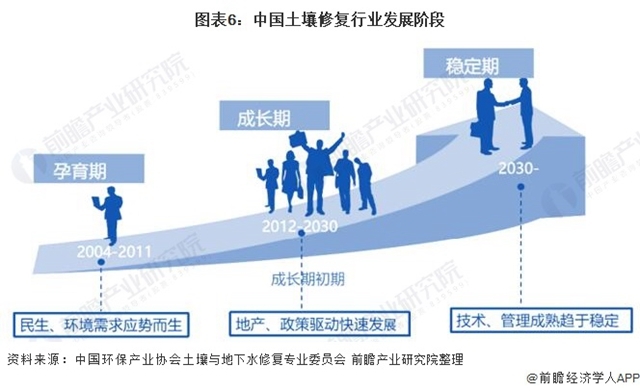 相較國(guó)外,國(guó)內(nèi)土壤及地下水修復(fù)行業(yè)相對(duì)國(guó)外而言起步較晚,大致劃分為三個(gè)階段—孕育期、成長(zhǎng)期、穩(wěn)定期,我國(guó)土壤及地下水修復(fù)行業(yè)目前處于成長(zhǎng)期。