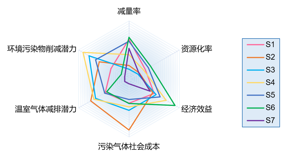 通過綜合考慮多項(xiàng)指標(biāo),可以得到各項(xiàng)技術(shù)的指標(biāo)表現(xiàn)雷達(dá)圖,同時(shí)也可以看出各指標(biāo)下不同處理技術(shù)的表現(xiàn)排名。