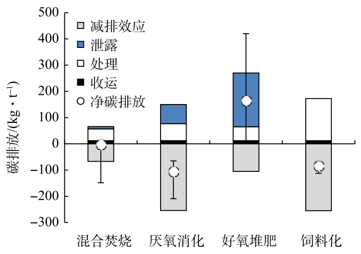 在廚余垃圾處理過(guò)程中,附加碳排放一般不到 50 kg·t?1,收運(yùn)過(guò)程的碳排放也相對(duì)較小,因此系統(tǒng)熱效率、有機(jī)質(zhì)降解率和溫室氣體泄漏率是影響不同處理模式碳排放的主要因素。飼料化和厭氧消化具有最好的碳減排效應(yīng),而混合焚燒的碳減排效應(yīng)可忽略不計(jì)。好氧堆肥受到溫室氣體泄漏的影響,會(huì)產(chǎn)生較多的碳排放,當(dāng)堆肥工藝運(yùn)行良好,無(wú) CH4 和 N2O 排放時(shí),好氧堆肥可產(chǎn)生碳減排效應(yīng)。