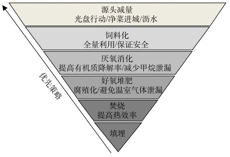 3. 廚余垃圾管理的優(yōu)先策略依次為:源頭減量>飼料化>厭氧消化>好氧堆肥>混合焚燒。
