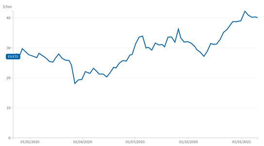 歐盟碳市場的穩(wěn)定結(jié)構(gòu)框架以及歐盟內(nèi)部長期政策的合理性在2020年的運行中得到較好體現(xiàn)。2020年是歐盟碳市場第三階段運行的最后一年,也是第四交易階段的密集準備階段,碳價格在3、4月有短期大幅下降,從年初最高29.68美元降至4月最低18.04美元,但5月后價格又逐漸回升,并在7月達到33.89美元,此后一直在30美元左右徘徊,最后在同年12月達到42.16美元。在未來,歐盟《綠色新政》一攬子復蘇計劃以及《歐盟氣候法》中包含的2030年的新目標將催生更大的氣候雄心,而碳市場的優(yōu)化改革將有助于實現(xiàn)這些氣候目標。