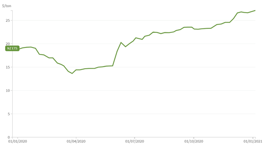 碳價格方面,新冠肺炎疫情期間,受制于經(jīng)濟緩滯,新西蘭碳配額價格從2020年1月的18.83美元降至3月14.35美元,后續(xù)逐步回升至年底的26.78美元。表明市場投資者意識到隨著碳排放上限的設(shè)定、固定價格期權(quán)的取消,碳市場需求將會進一步提升。