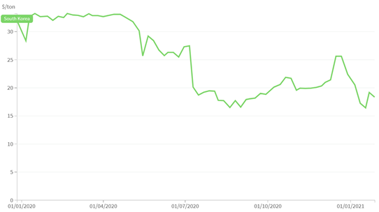 近兩年在韓國碳市場中,碳價持續(xù)處于波動狀態(tài)。2020年是韓國碳市場(K-ETS)運行第二階段的最后一年,受新冠疫情影響, 2020年的價格波動更加劇烈。碳價格在2020年4月初達到頂峰(35.92美元),然后從5月開始大幅下降至16.95美元,8月開始反彈至12月初達到25.84美元,12月末又有所回落(19.49美元)。2020年9月,韓國總統(tǒng)文在寅宣布將在2050年之前實現(xiàn)凈零排放的長期目標,預計將在未來幾年更新氣候政策框架,促進對低碳技術(shù)的投資。