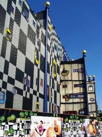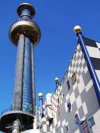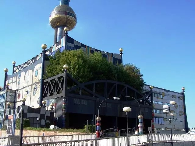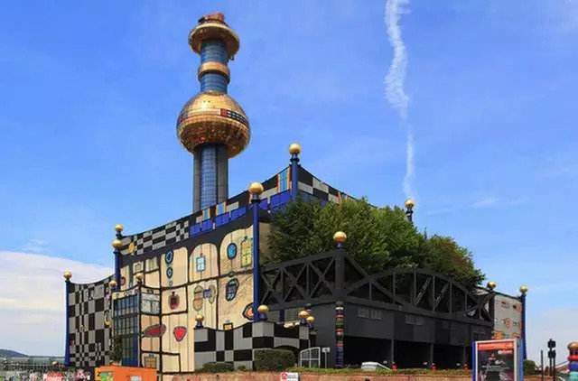 景觀設計:這座建筑物是奧地利有名的藝術家、建筑設計師百水先生的杰作。工程從1988年至1992年進行了四年建成。居民遠遠就可以看見一個高高聳立的大煙囪,中部有一個碩大的金色球體,在藍天下格外醒目。這金色的圓形球體會讓人聯想到某明珠電視塔的旋轉餐廳,其實不然。這就是垃圾焚燒廠的控制室。色彩斑斕而充滿童趣的外墻立面,讓人感覺就像是一座童話城堡。 外墻面上隨意涂抹的卡通畫,有的是各種色彩的水果,有的是各種性能的用具,煞是可愛。