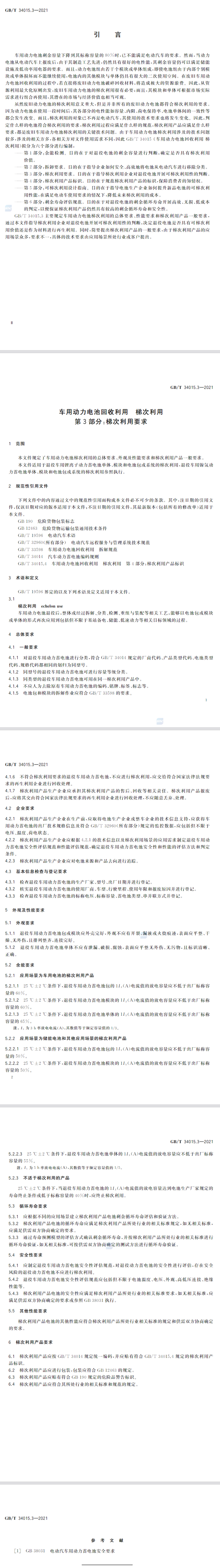 本文件是GB/T 34015“車用動力電池回收利用、梯次利用”的第3部分。GB/T 34015已經(jīng)發(fā)布了以下部分: