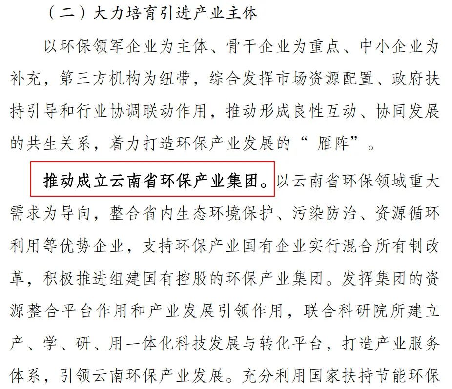 不過,這個“福建省生態(tài)環(huán)保集團”到底什么時候組建完成,其中都包括什么內(nèi)容,一切具體的信息就都不知道了。還有云南,今年7月,云南省發(fā)布《云南省“十四五”環(huán)保產(chǎn)業(yè)發(fā)展規(guī)劃(征求意見稿)》,其中提到,要推動成立云南省環(huán)保產(chǎn)業(yè)集團。以云南省環(huán)保領(lǐng)域重大需求為導(dǎo)向,整合省內(nèi)生態(tài)環(huán)境保護、污染防治、資源循環(huán)利用等優(yōu)勢企業(yè),支持環(huán)保產(chǎn)業(yè)國有企業(yè)實行混合所有制改革,積極推進組建國有控股的環(huán)保產(chǎn)業(yè)集團。