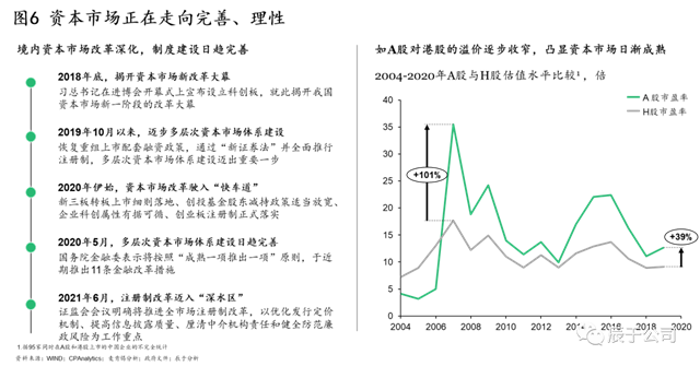 政策推動下,國內(nèi)資本市場改革逐步深化,制度建設(shè)日趨完善,生態(tài)環(huán)保企業(yè)面臨的資本市場大環(huán)境正走向理性。A股對H股的溢價逐步收窄便是其中一佐證:基于對95家同時在A股和港股上市的企業(yè)的分析,可以看到相比于2006年最高峰時A股對H股超過100%的溢價,當(dāng)前30%-40%的溢價已有明顯收窄(見圖6)。