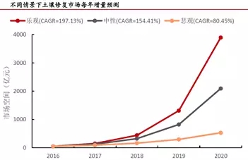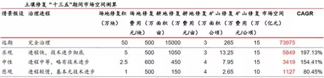 土壤修復(fù)十三五市場(chǎng)空間1100億-5900億,遠(yuǎn)期市場(chǎng)總量在7.4萬億元左右。在中性情景下,十三五市場(chǎng)空間總量約3400億。