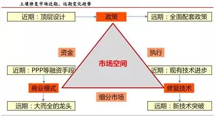 政策層面。長期尺度下,政策層面最值得期待的驅(qū)動(dòng)因素是在土壤修復(fù)所有領(lǐng)域、全國大部分區(qū)域的配套性政策全面出臺(tái)。與短期尺度相比,長期尺度下政府必須向治理難度更大、經(jīng)濟(jì)效益更弱的修復(fù)任務(wù)“開刀”。