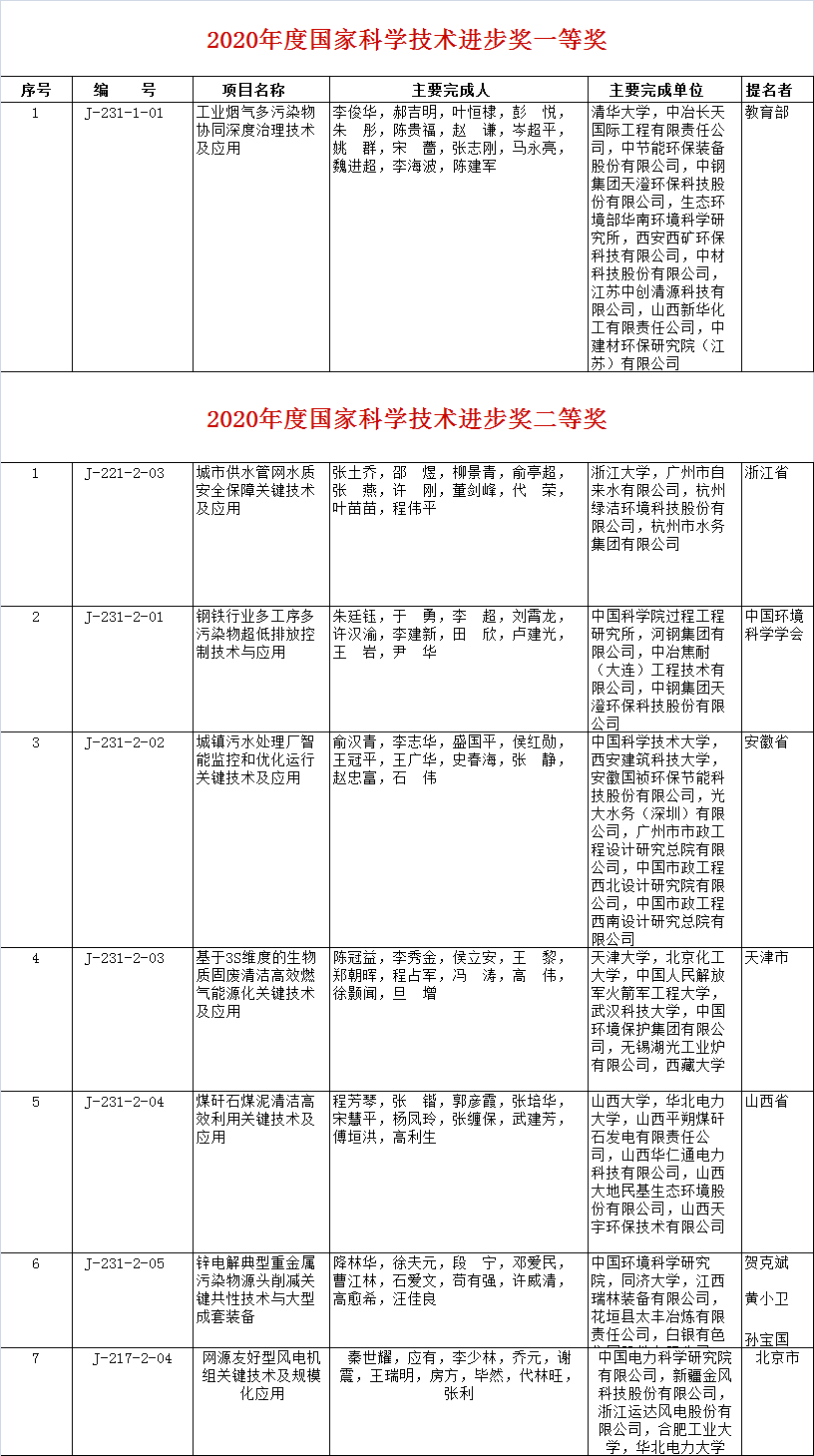 環(huán)境商會匯總整理了生態(tài)環(huán)境領(lǐng)域獲獎名單,共有11個項目榮獲2020年國家科技獎,其中,王愛杰、彭永臻、中國科學(xué)院生態(tài)環(huán)境研究中心程浩毅、梁斌、中持股份邵凱、信開水環(huán)境侯鋒等共同完成的“污水深度生物脫氮技術(shù)及應(yīng)用”項目榮獲國家技術(shù)發(fā)明獎二等獎,李俊華,郝吉明、中節(jié)能環(huán)保裝備等聯(lián)合完成的“工業(yè)煙氣多污染物協(xié)同深度治理技術(shù)及應(yīng)用”項目榮獲國家科技進(jìn)步獎一等獎;俞漢青、中節(jié)能國禎、光大水務(wù)等聯(lián)合完成的“城鎮(zhèn)污水處理廠智能監(jiān)控和優(yōu)化運行關(guān)鍵技術(shù)及應(yīng)用”;新疆金風(fēng)科技等申報的“網(wǎng)源友好型風(fēng)電機組關(guān)鍵技術(shù)及規(guī)?;瘧?yīng)用”等項目榮獲國家科技進(jìn)步二等獎。