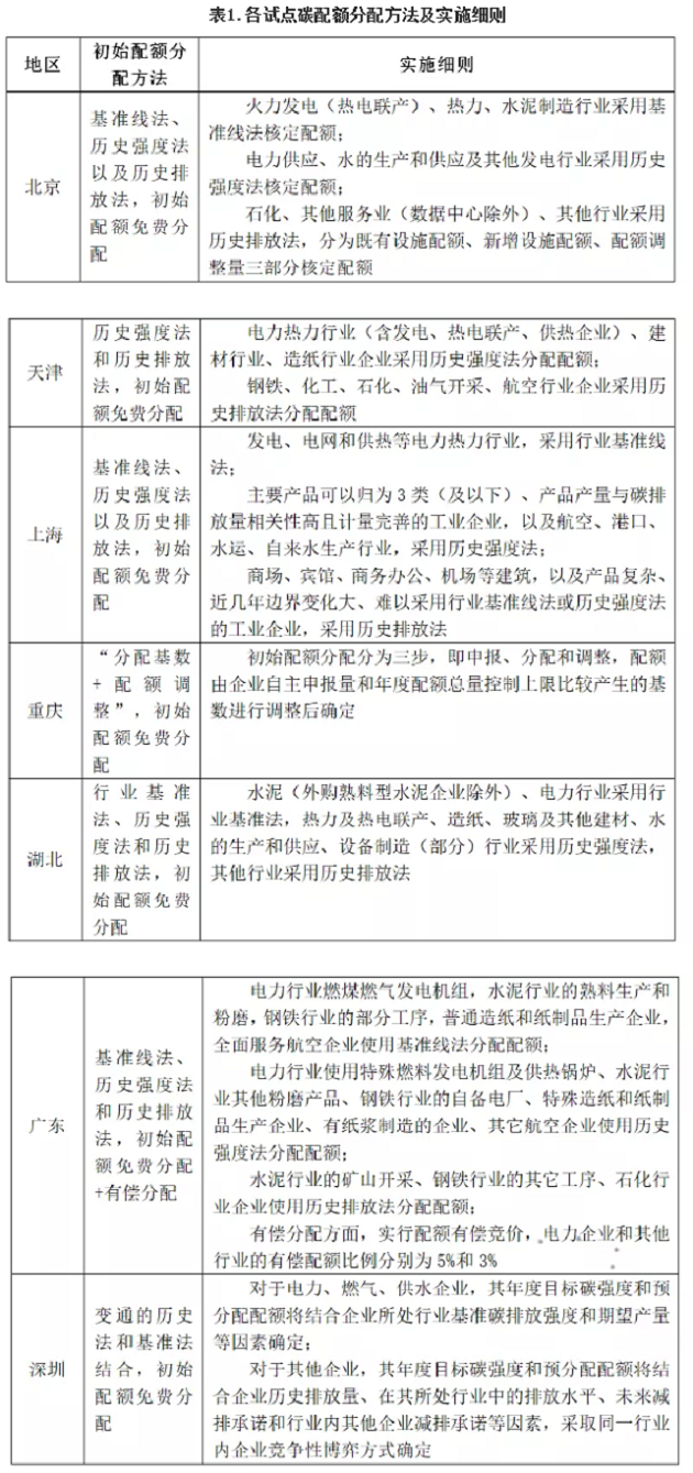 因此,在研究交易市場的價格機制時,必須首先研究碳交易的一級市場價格形成機制,其中最重要的是碳配額的分配機制。我國初始的分配方法可大致分為無償分配與有償分配兩種,無償分配主要是有基準線法與祖父法(歷史強度法),而有償分配主要是有政府統(tǒng)一定價與拍賣兩種。目前,除全國統(tǒng)一碳市場試運行的基準線法外,其他試點碳市場對初始碳配額的分配方法如下: