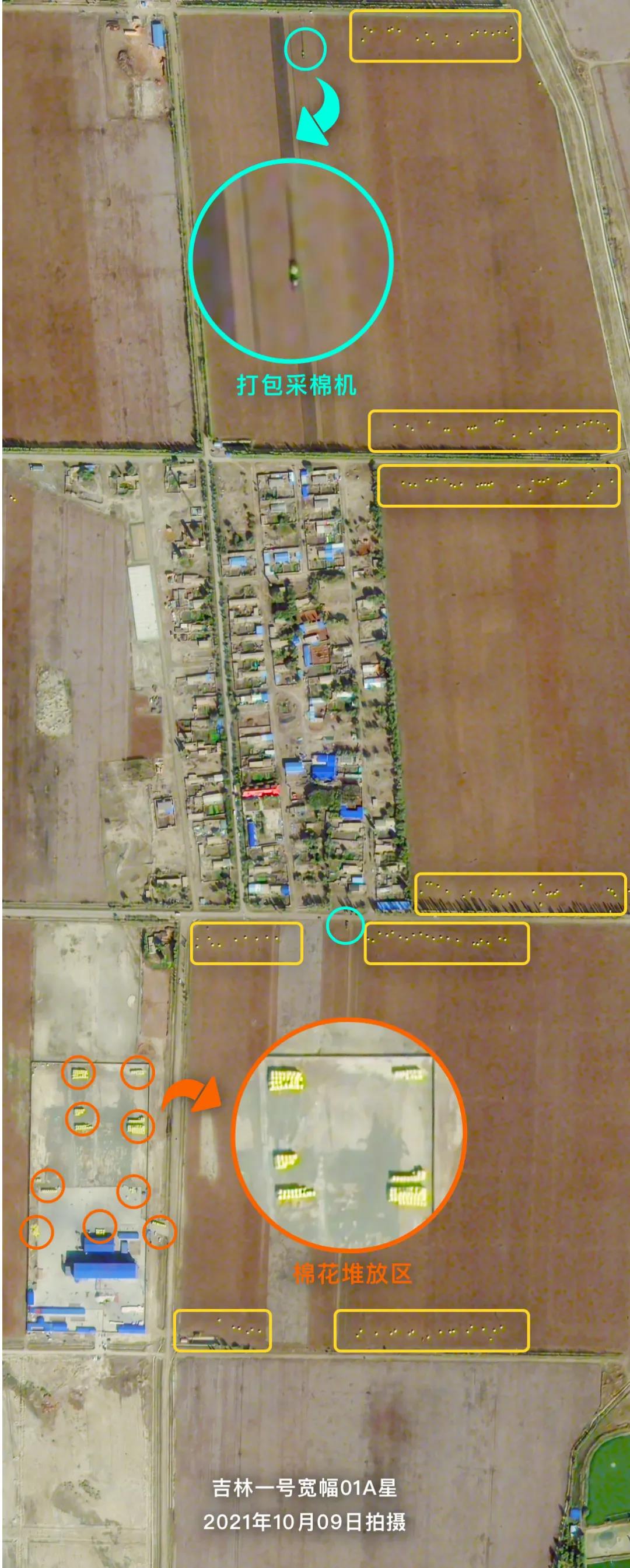 金秋時(shí)節(jié),新疆各地棉花陸續(xù)進(jìn)入采收期。吉林一號(hào)衛(wèi)星從太空記錄下了新疆昌吉回族自治州阜康市機(jī)械化采收棉花的忙碌場(chǎng)景,壓縮打包完成的棉花卷堆積在棉田周?chē)?,正在等待運(yùn)輸。