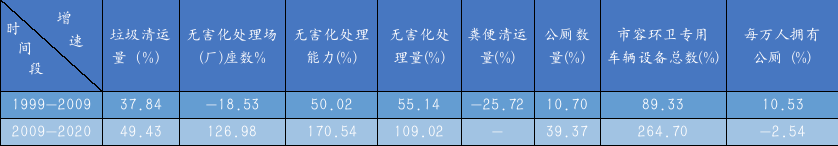從上述統(tǒng)計(jì)看。截至1989年,全國(guó)只有37座生活垃圾無(wú)害化處理場(chǎng)(廠),雖然較1979年的12座翻了幾番,但與1999年數(shù)據(jù)相比,堪稱一窮二白,為避免數(shù)值失真,筆者在計(jì)算各指標(biāo)增速時(shí)僅從1999年開始,大致以每十年為一個(gè)跨度來計(jì)算,統(tǒng)計(jì)結(jié)果如表2所示。表2 1999-2020年全國(guó)市容環(huán)衛(wèi)行業(yè)各指標(biāo)增速