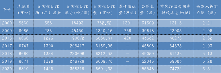 從表2可見,市容環(huán)衛(wèi)行業(yè)在2009年以后的發(fā)展可謂突飛猛進(jìn),從2009-2020年,全國(guó)垃圾清運(yùn)量增加49.43%,相比1999-2009年間,增速提升了11.6個(gè)百分點(diǎn);同一時(shí)期,無(wú)害化處理場(chǎng)數(shù)量增長(zhǎng)126.98%,而前一個(gè)10年則是-18.53%;其他指標(biāo),垃圾無(wú)害化處理能力、垃圾無(wú)害化處理量、市容環(huán)衛(wèi)專用車輛設(shè)備總數(shù)均以倍速提升;公廁數(shù)量則增加了39.37%,而前一10年增速僅為10.70%。每萬(wàn)人擁有的公廁數(shù)量是唯一一個(gè)下降的指標(biāo),考慮最近10年中國(guó)城市化的高速度,似乎也可以理解。最遺憾的還是糞便清運(yùn)量,從2017年開始就無(wú)統(tǒng)計(jì)數(shù)據(jù),而歷史數(shù)據(jù)也是上下起伏不定。糞便處置不僅與廁所革命密切相關(guān),更關(guān)系到自然水體保護(hù)和食品安全,期待糞便處置能夠得到更多重視。《年鑒》顯示,2020年,全國(guó)縣城生活垃圾清運(yùn)量達(dá)6810萬(wàn)噸(約0.68億噸),總計(jì)擁有1428座無(wú)害化處理場(chǎng)(廠),生活垃圾處理能力358,319噸/日(約35.83萬(wàn)噸/日),年無(wú)害化處理生活垃圾6691.32萬(wàn)噸(約0.67億噸)??h城總計(jì)擁有公廁55,548座(5.55萬(wàn)座),平均每萬(wàn)人擁有公廁3.51座,全國(guó)縣城共擁有環(huán)衛(wèi)專用車輛設(shè)備74,722輛(約7.47萬(wàn)輛)。表3 2000-2020年全國(guó)縣城市容環(huán)衛(wèi)總體情況(大致按年代跨度)