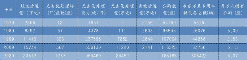 《年鑒》分別統(tǒng)計(jì)了城市、縣城和村鎮(zhèn)三部分市容環(huán)衛(wèi)大數(shù)據(jù),其中城市部分最為詳盡,包括了從1979-2020年的生活垃圾清運(yùn)量、垃圾處理場(chǎng)(廠)數(shù)量、無(wú)害化處理能力、無(wú)害化處理量、糞便清運(yùn)量、市容環(huán)衛(wèi)專用車輛設(shè)備總數(shù)、公廁數(shù)量及每萬(wàn)人擁有公廁數(shù)(個(gè)別年份和統(tǒng)計(jì)項(xiàng)目空缺);縣城部分也包括上述統(tǒng)計(jì)項(xiàng)目,但日期是從2000年開始至2020年;村鎮(zhèn)部分則只有2020年數(shù)據(jù),統(tǒng)計(jì)項(xiàng)目只包含生活垃圾中轉(zhuǎn)站數(shù)量、環(huán)衛(wèi)專用車輛設(shè)備總數(shù)和公廁數(shù)量。《年鑒》顯示,2020年,全國(guó)城市生活垃圾清運(yùn)量達(dá)23,512萬(wàn)噸(約2.351億噸),總計(jì)擁有1287座無(wú)害化處理場(chǎng)(廠),生活垃圾處理能力963,460.15噸/日(約96.35萬(wàn)噸/日),年無(wú)害化處理生活垃圾23,452萬(wàn)噸(約2.345億噸)。全國(guó)城市擁有165,186座(約16.52萬(wàn)座)公廁,平均每萬(wàn)人擁有3.07座公廁,全國(guó)城市共擁有環(huán)衛(wèi)專用車輛設(shè)備306,422輛(約30.64萬(wàn)輛)。表1 1979-2020年全國(guó)城市市容環(huán)衛(wèi)總體情況(大致按年代跨度)