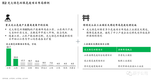 在危廢產(chǎn)量高的省份,頭部企業(yè)更是具有絕對(duì)優(yōu)勢(shì),例如光大綠色環(huán)保,一方面重點(diǎn)關(guān)注危廢產(chǎn)生量高度集中的區(qū)域,早早布局江蘇、山東兩個(gè)產(chǎn)廢大省和貯存大省,將其60%的產(chǎn)能都布局于此,兩省累計(jì)布局超過110萬噸的產(chǎn)能,以此為基礎(chǔ),在江蘇、山東產(chǎn)能逐漸過剩時(shí),其最新的項(xiàng)目開始以江蘇為中心向東南各省擴(kuò)展;另一方面,他們也特別關(guān)注危廢產(chǎn)量高省份在工業(yè)園區(qū)及周邊布局危廢處理設(shè)施,擁有多個(gè)危廢項(xiàng)目布局在工業(yè)園區(qū)及周邊,保障危廢來源,避免了中小產(chǎn)廢企業(yè)遷移或關(guān)停造成拿料困難的情況(見圖2)。