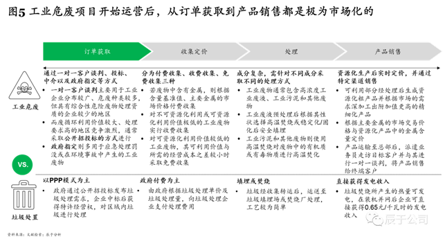 值得注意的是,工業(yè)危廢運(yùn)營階段的競(jìng)爭同樣十分激烈,從來料獲取到產(chǎn)品銷售都極為市場(chǎng)化(見圖5)。以訂單獲取為例,工業(yè)危廢往往需要通過一對(duì)一客戶談判、投標(biāo)、中介以及政府指定等方式來展開,這與傳統(tǒng)的垃圾處置行業(yè)以PPP模式為主是截然不同的。