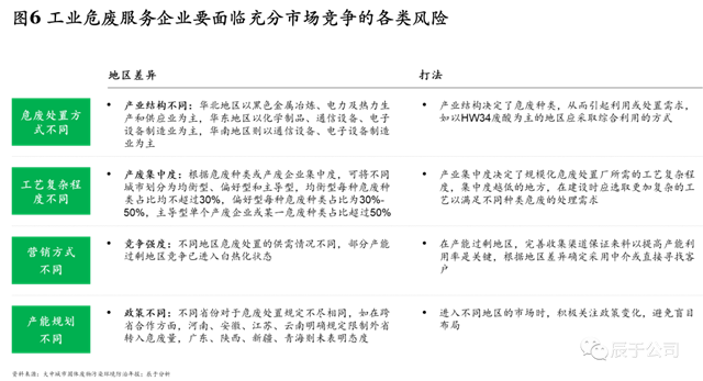 這不禁引起我們對(duì)這一市場(chǎng)的重新審視。通過對(duì)最新政策的解讀、對(duì)上游產(chǎn)廢企業(yè)的調(diào)研,以及與工業(yè)危廢企業(yè)的深入交流,我們?cè)诒緢?bào)告中仍將維持之前的判斷:相比其他細(xì)分市場(chǎng),有規(guī)模、有增速、盈利水平中上、行業(yè)集中度低的工業(yè)危廢市場(chǎng)仍然值得關(guān)注,只不過對(duì)后進(jìn)入者,當(dāng)前的競(jìng)爭環(huán)境確實(shí)“兇險(xiǎn)”,所面臨的四大挑戰(zhàn),讓他們想“彎道超車”變得困難重重: