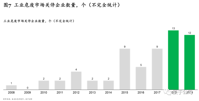 一是與市場(chǎng)需求種類不匹配,根據(jù)2019年最新修訂發(fā)布的《國家危險(xiǎn)廢物名錄》,我國危險(xiǎn)廢物分類共有46大類,471種,而我國90%以上危廢處置企業(yè)僅能處置5種或以下的危廢種類,供需種類錯(cuò)配的現(xiàn)象較嚴(yán)重;二是產(chǎn)能落后,處置規(guī)模小,技術(shù)和使用設(shè)備落后,無法滿足污染防治的要求;三是安全隱患突出,環(huán)境管理水平低下以及相關(guān)危險(xiǎn)廢物經(jīng)營安全的規(guī)章制度不完善,導(dǎo)致環(huán)境安全隱患問題突出。可以預(yù)見的是,隨著市場(chǎng)競(jìng)爭日益激烈,“小而弱”的工業(yè)危廢企業(yè)將越來越難以適應(yīng)市場(chǎng)新要求,頻頻被“出清”。據(jù)不完全統(tǒng)計(jì),2010-2014年,每年關(guān)停的工業(yè)危廢服務(wù)企業(yè)僅為2——4家,2018和2019年則分別達(dá)到了13和12家(見圖7)。