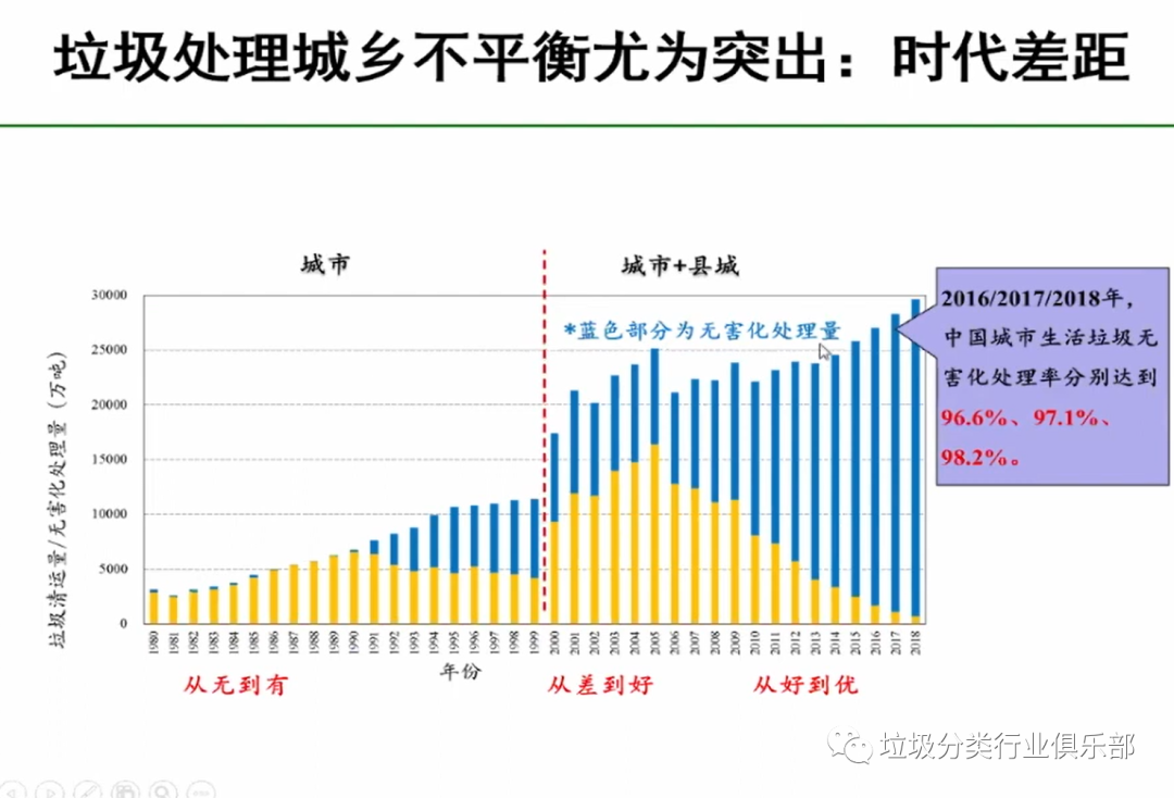 當前城市的垃圾處理基本問題已解決,現(xiàn)在要在分類的新的理念引領(lǐng)下,我們向著可以構(gòu)建新型模式,但是我們大的無害化處理這些問題已基本得到解決。2018年垃圾的垃圾無害化處理已經(jīng)達到了98.2%,而農(nóng)村連基本數(shù)據(jù)都沒有,農(nóng)村的數(shù)據(jù)很多都是估計的?,F(xiàn)代化的管理是數(shù)字化的管理、信息化的管理,沒有數(shù)字就表明對它是沒有管理。底數(shù)不清,說明對它的管理薄弱。