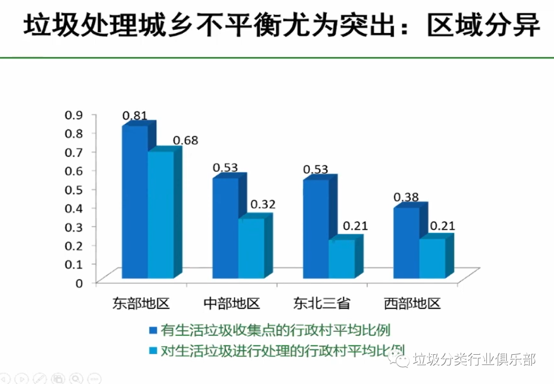 垃圾處理方面,區(qū)域差異性比較大。經(jīng)濟比較發(fā)達的東部地區(qū)、其次是中部略微要好些。東部很多地方都已經(jīng)通過城鄉(xiāng)一體化的管理以及垃圾的處理,基本上有了一些保障,但是東北、西部依然看到有生活垃圾收集點的行政村比例都很低,處理的就更低了。