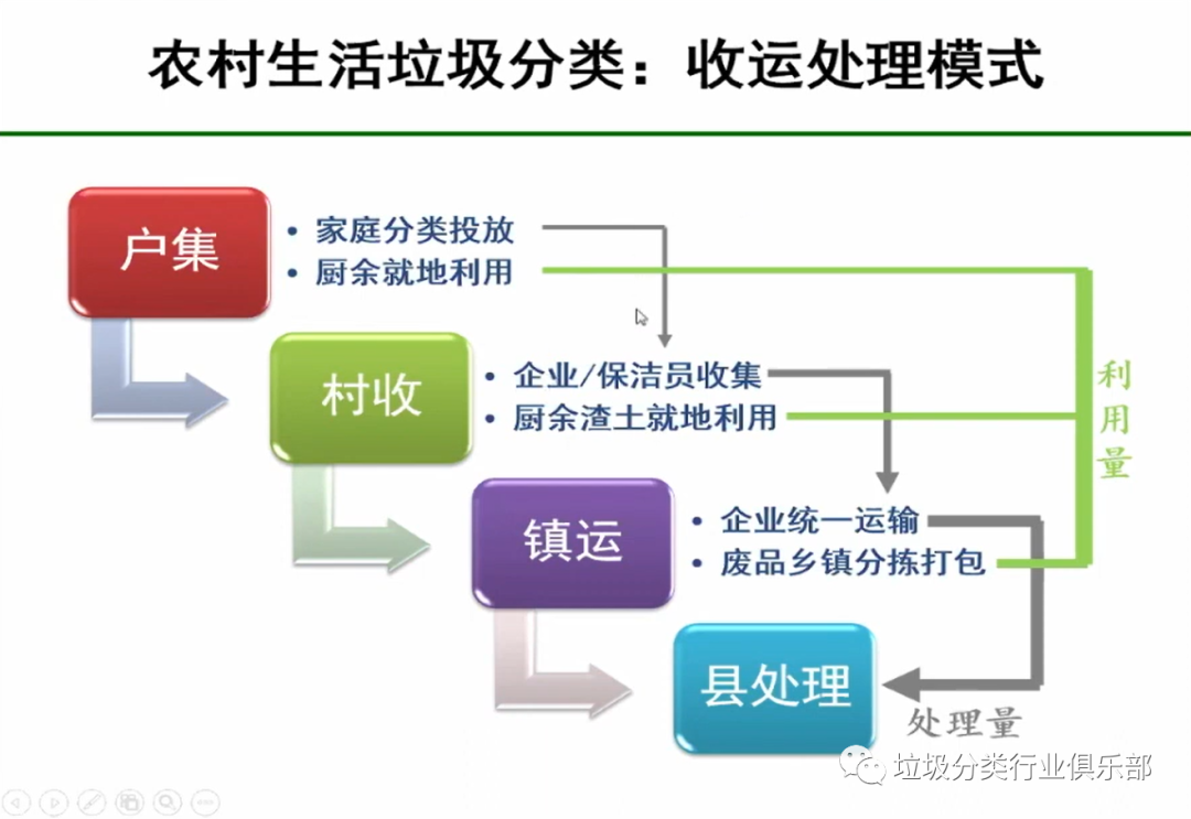 農(nóng)村生活垃圾收運處理模式整體來說是戶籍-村收-鎮(zhèn)運-縣處理。在這種情況下,一部分垃圾比如廚余垃圾,家庭、村、鄉(xiāng)鎮(zhèn)都可以去就地利用。廢舊物品等有一定價值的,這些我們建立一個回收體系。而有害垃圾和其它垃圾是需要外運去處理的??偟膩碚f,垃圾量已經(jīng)不大了,所以收運處理模式還是比較容易去做的。
