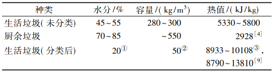 由表1可知:由于含有大量水分且容量較大的廚余垃圾被分離,分類后垃圾的水分含量約為20%,美國(guó)(19.02%)、歐洲(34.00%)、韓國(guó)(30.29%)相接近。水分降幅達(dá)到25百分點(diǎn)以上,使得可燃物質(zhì)的占比提升,單位垃圾熱值提升,同時(shí)在焚燒過程中由水分蒸發(fā)吸熱帶走的熱量也相應(yīng)減少,有利于垃圾焚燒放出熱量的充分利用。此外,分類后的生活垃圾以紙類﹑橡膠類、木竹類為主,容量明顯下降,依據(jù)加權(quán)計(jì)算結(jié)果僅為50 kg/m3,相對(duì)于同一焚燒爐來說,在保持進(jìn)料速率不變的情況下,分類后生活垃圾單位時(shí)間內(nèi)的進(jìn)料量相比未分類生活垃圾減少83%。
