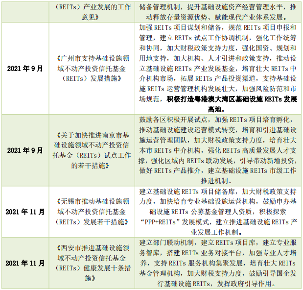 另外,中央、地方政府出臺的部分政策文件、省市區(qū)域的遠景規(guī)劃也將REITs列為重要內(nèi)容之一,推動REITs在重點省份、城市與行業(yè)的應(yīng)用和推廣。部分核心一、二線城市如北京、上海、成都、蘇州也相繼推出促進本市及所在區(qū)域的基礎(chǔ)設(shè)施REITs發(fā)展的政策或?qū)嵤┐胧?,?gòu)建本市基礎(chǔ)設(shè)施REITs發(fā)展工作體系,推動地方基礎(chǔ)設(shè)施REITs健康持續(xù)發(fā)展。